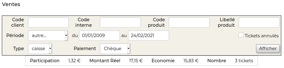 Sélectionnez un mode de paiement pour n’afficher que les ventes qui ont utilisé ce mode. Remarquez que les cumuls affichés tiennent compte du filtrage.