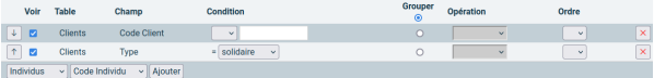 L’outil de requête permet de faire ressortir cette nouvelle notion dans la table “Client” et le champ “Type”, qui prendra les valeurs “bénéficiaire” ou “solidaire”.